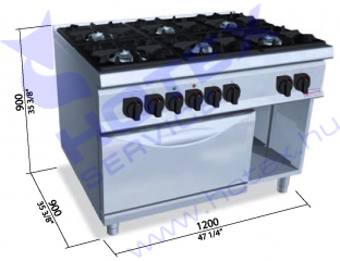 Főzőblokkba építhető kivitel rozsdamentes acél burkolattal, elektromos gyújtás, termoelektromos égésbiztosítás, őrláng, rozsdamentes acél kivehető medencék a gázégők alatt, öntöttvas edénytartó, elektromos üzemű statikus sütővel (4 x GN 2/1), nyitott alsó szekrénnyel, szintezhető lábakkal.