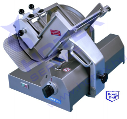 Professzionális gravitációs felvágott szeletelő gép (élelmiszer áruházi használatra is), rozsdamentes acél kivitel, automata kocsimozgatás, 36 löket/perc, maximális szeletméret 270 × 225 mm, átkapcsolható manuális üzemmód, védőburkolat, fokozatmentes szeletvastagság (0-25 mm) állítás, 330 mm átmérőjű keménykrómozott direkt hajtású kés, második kocsimozgató motor. Opcionális tartozék: teflonozott kés.